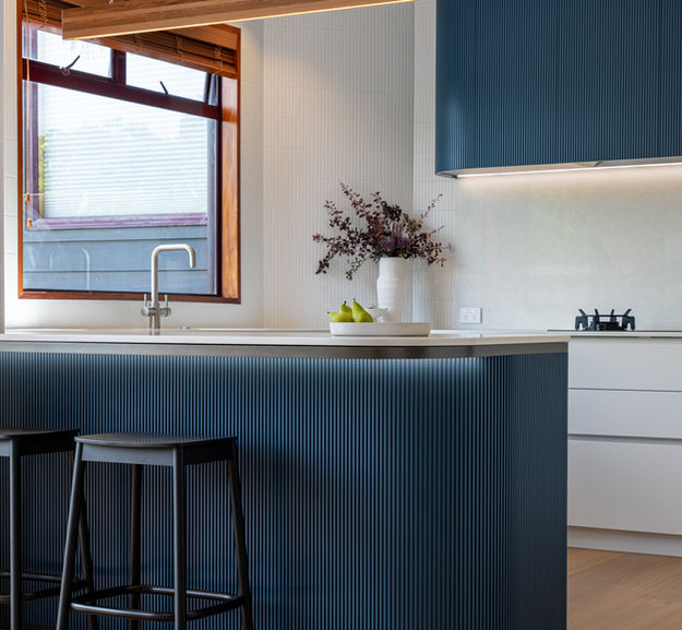 A palette of soft blues, whites and warm timber tones reflects the home’s coastal setting, while finger tiles and linear textures introduce depth and craft. The result is a kitchen that feels calm, inviting and quietly expressive.